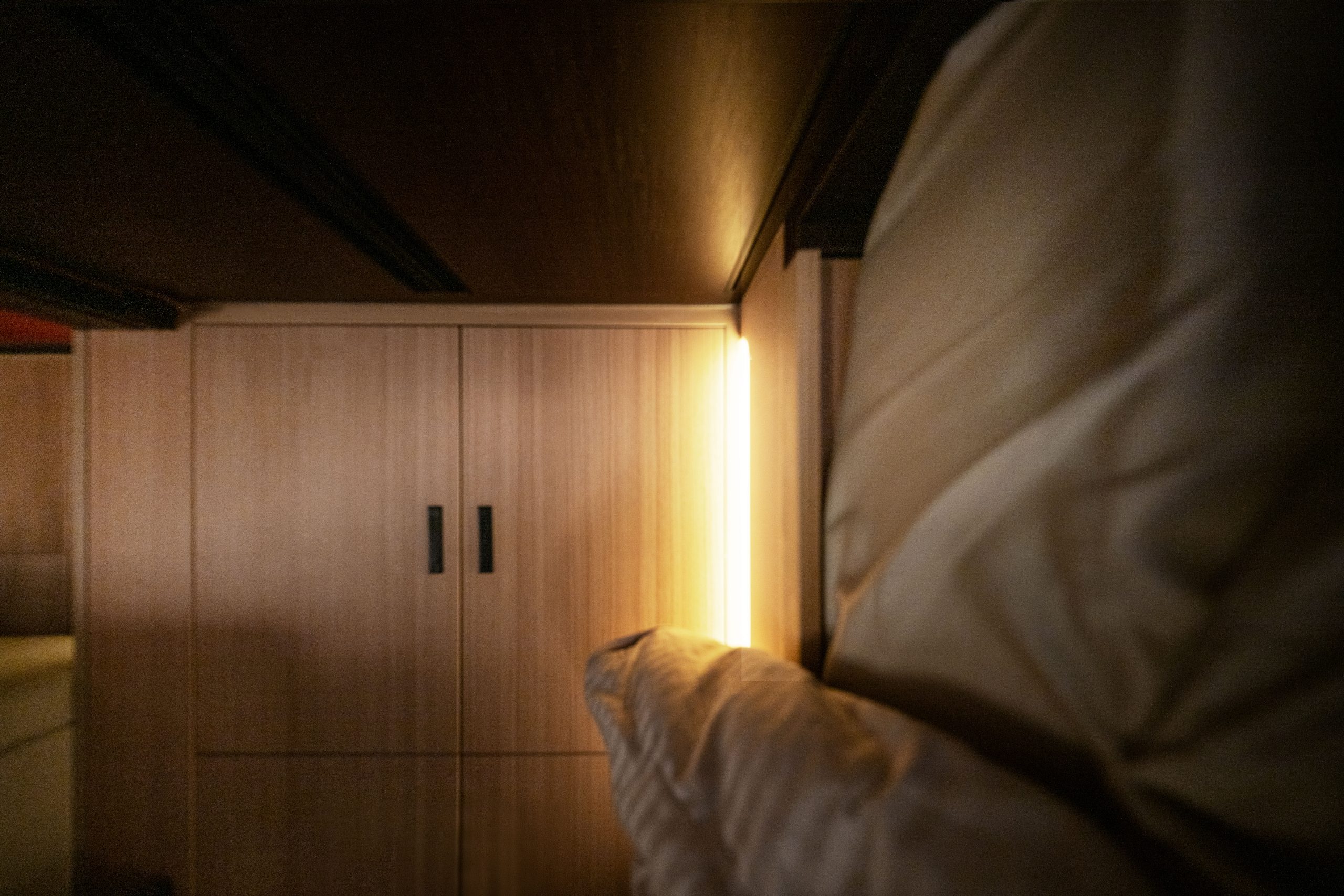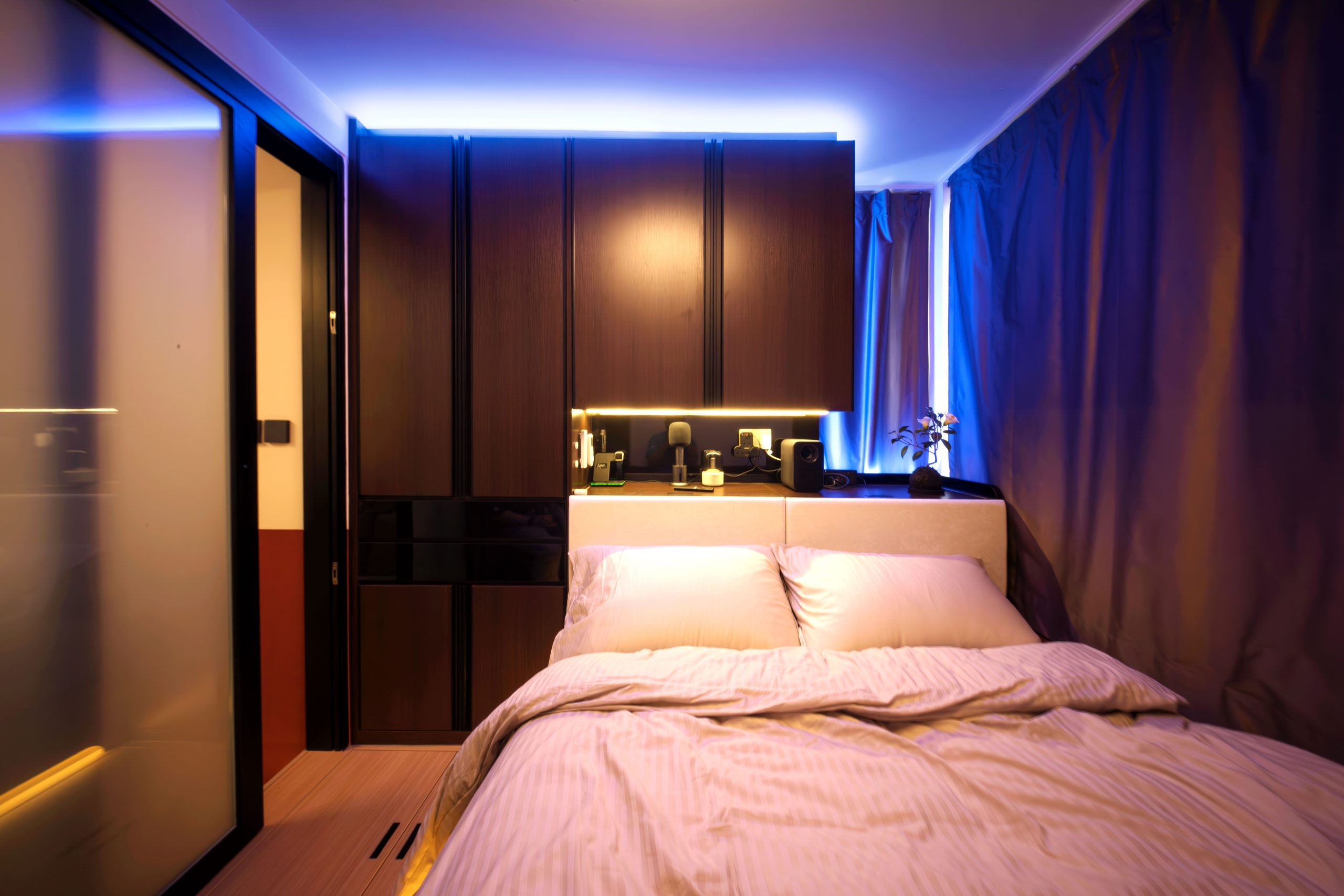 - 間接照明:床頭背景牆採用低色溫燈光,柔和光線助眠。