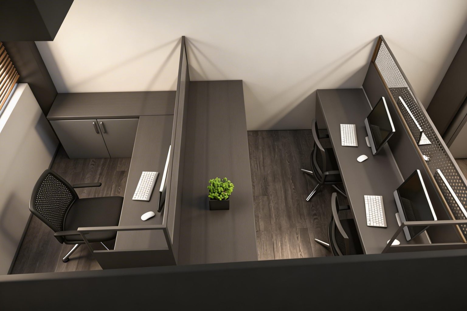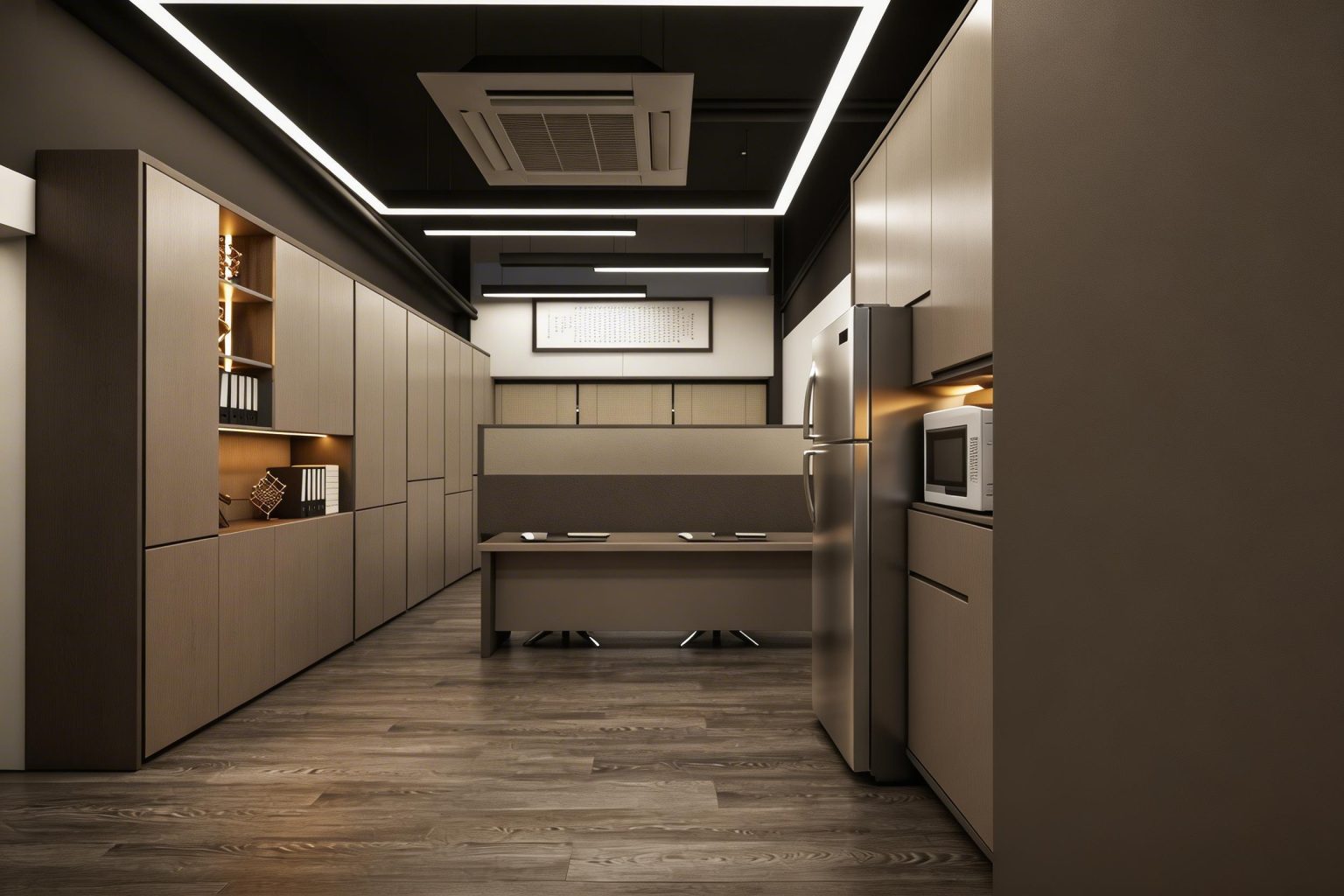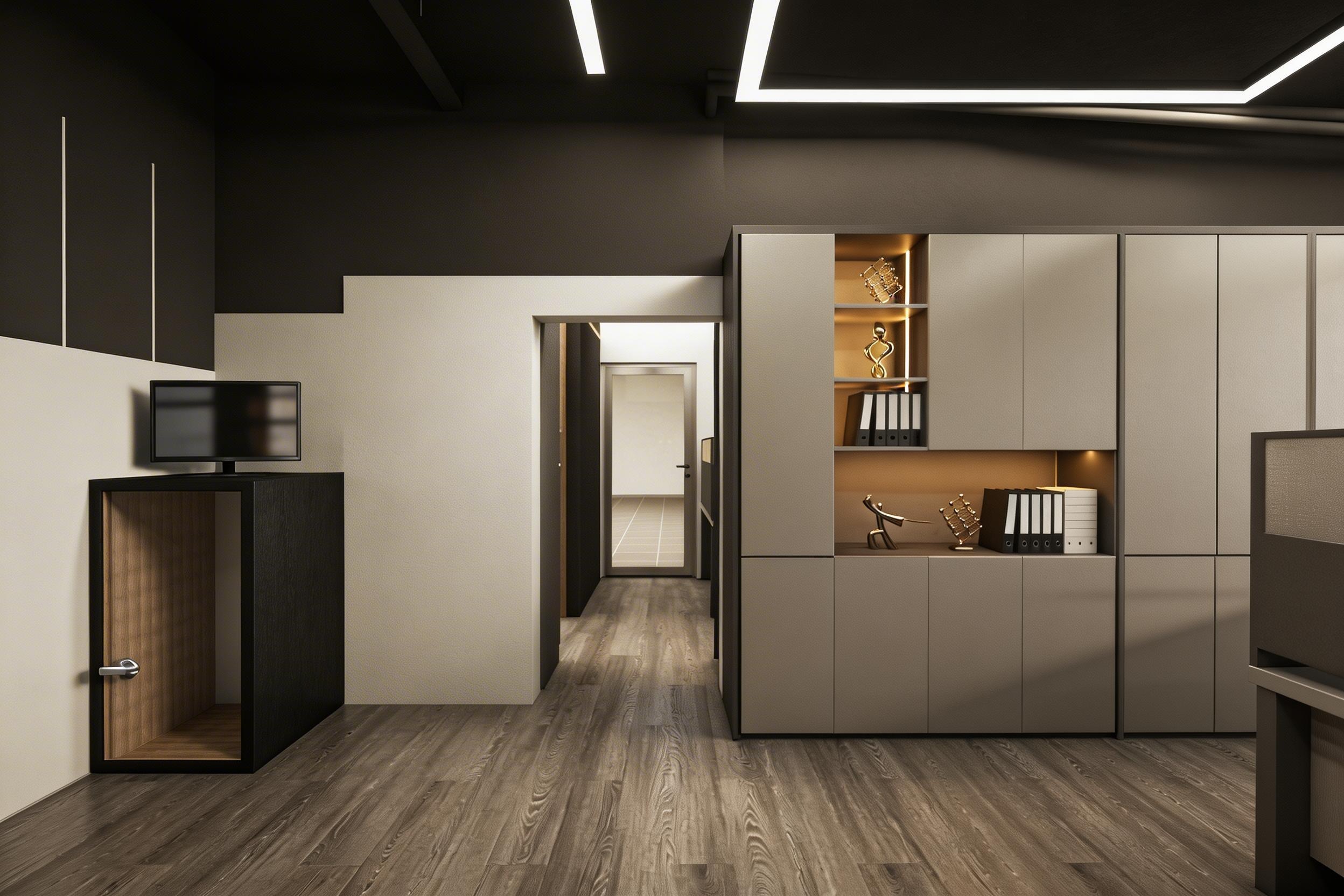 辦公室採用簡約現代風格,配有木質地板、灰色調家具和白色牆面,創造舒適高效的工作環境。設計亮點包括: