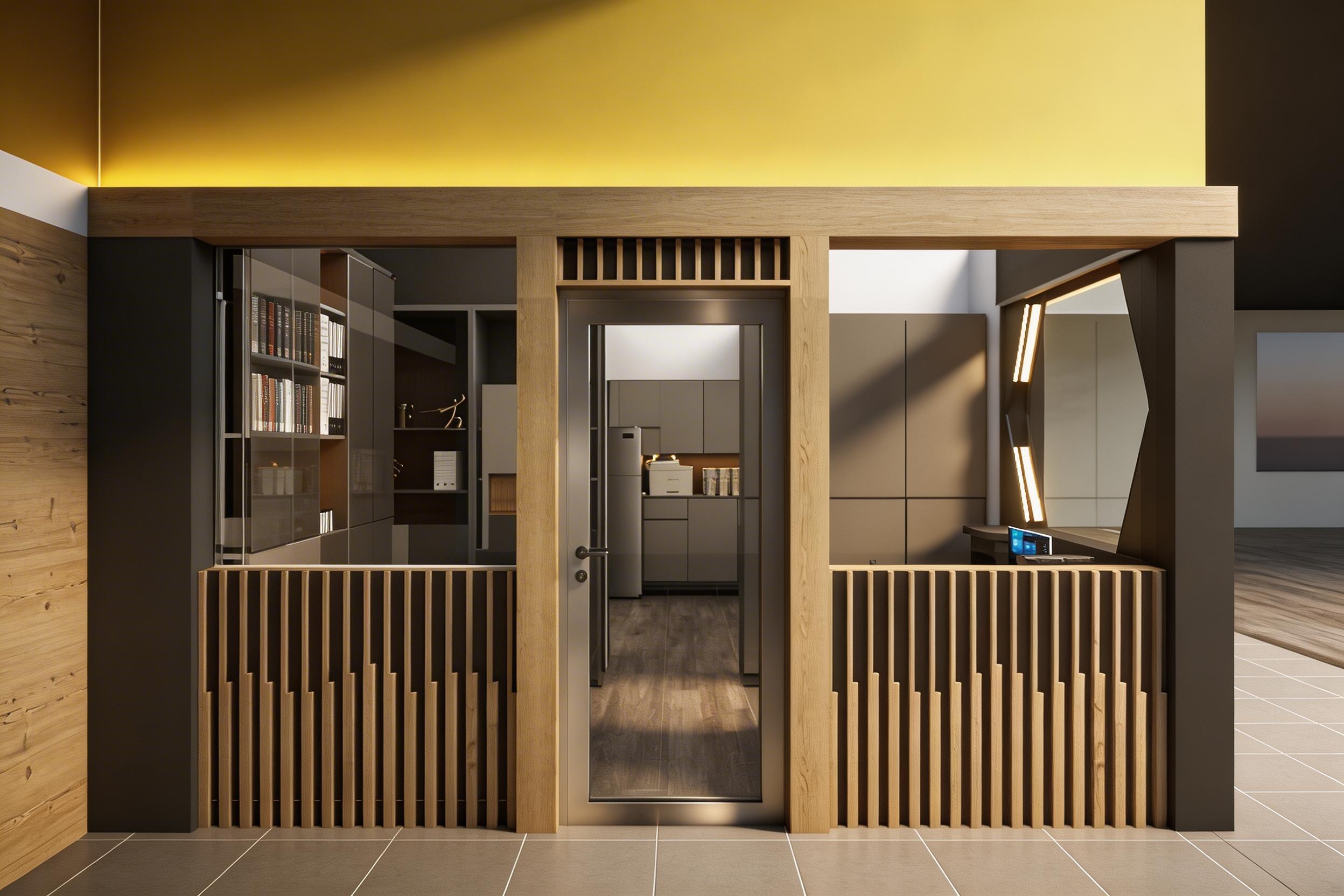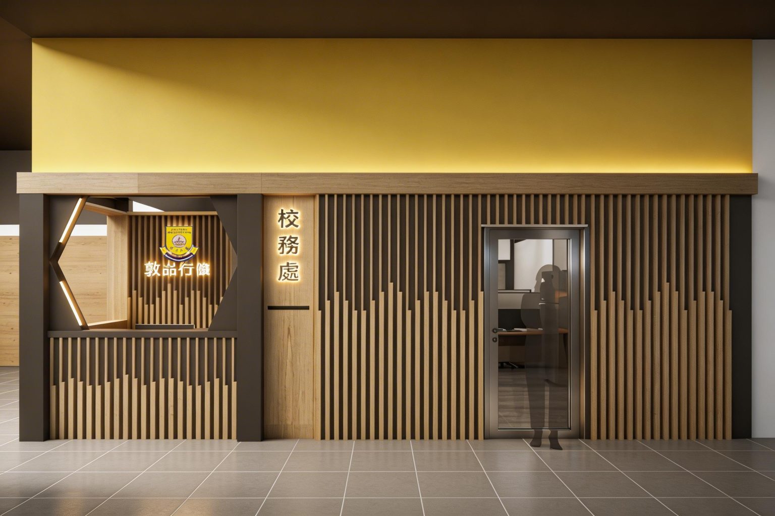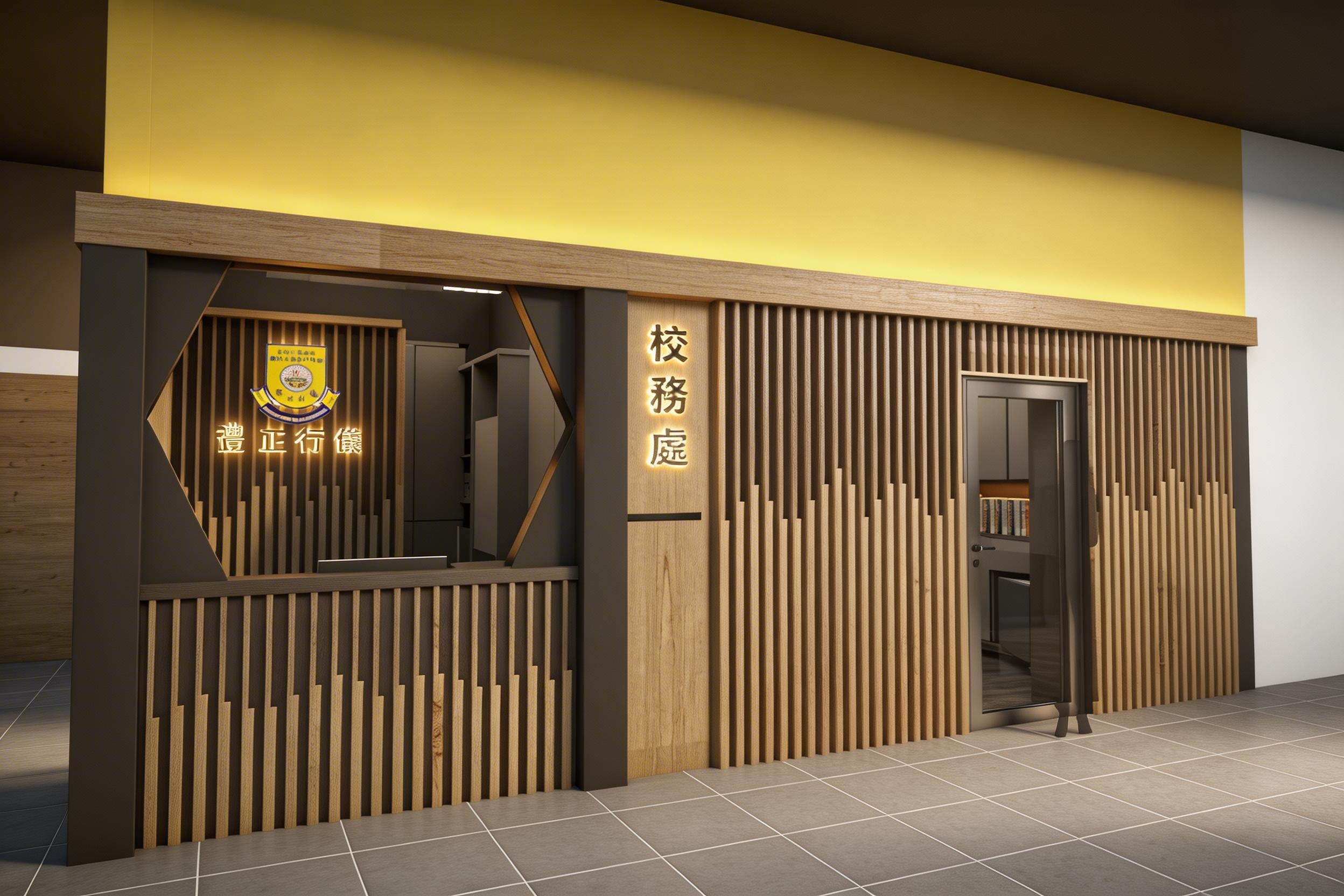 校務處設計以現代風格為主,採用木質隔板和黃色牆面,打造出明亮且專業的行政空間。設計包含接待櫃檯、玻璃門入口和標誌性學校徽章,展現教育機構的獨特身份。木質元素的垂直線條設計不僅增添視覺美感,還提升空間的層次感,適合用於學校行政辦公室。開放式布局與實用儲物空間相結合,滿足日常工作需求,同時營造舒適的工作環境。此設計適用於學校升級或新校舍規劃,吸引對教育設施設計感興趣的用戶。