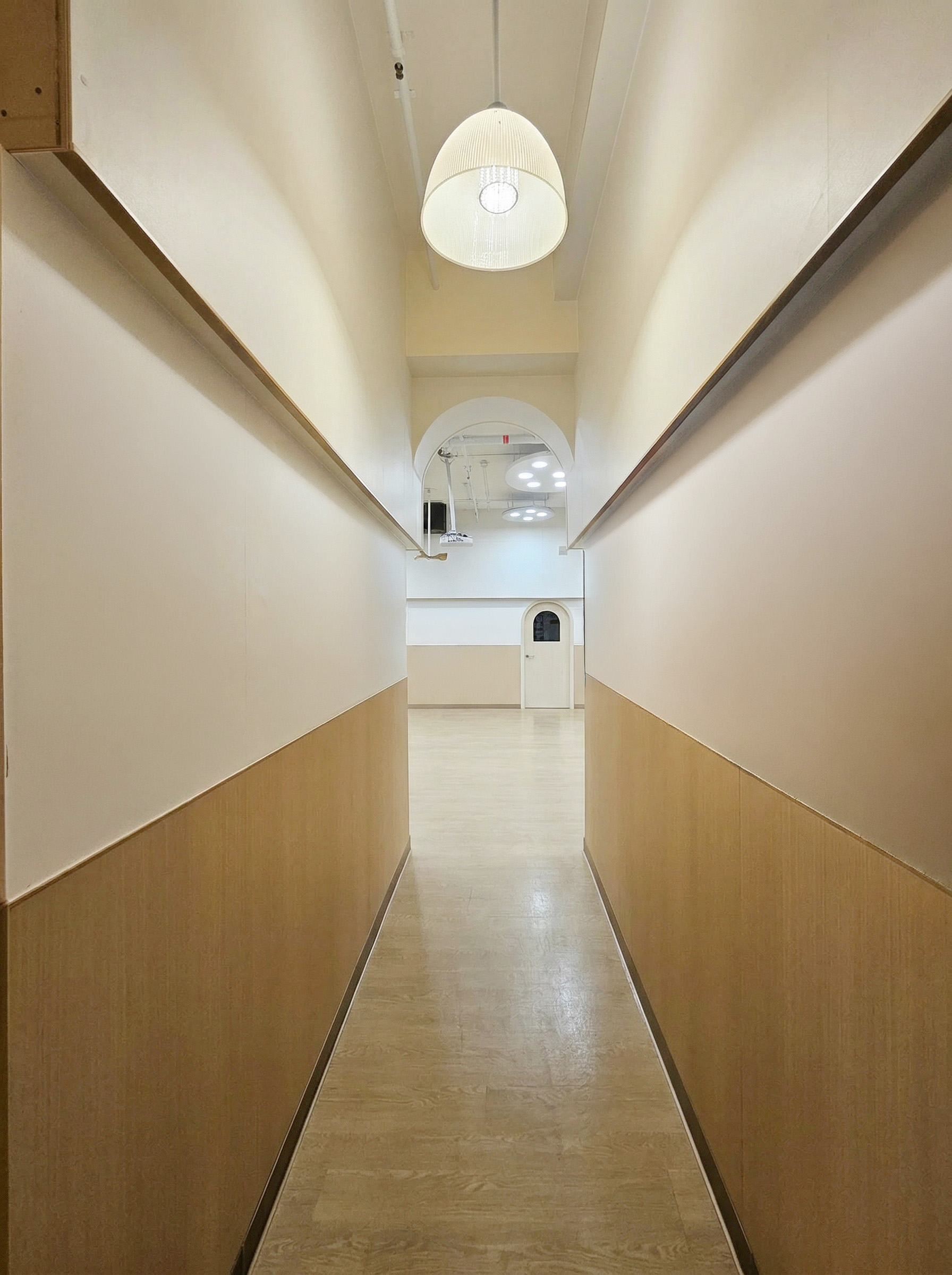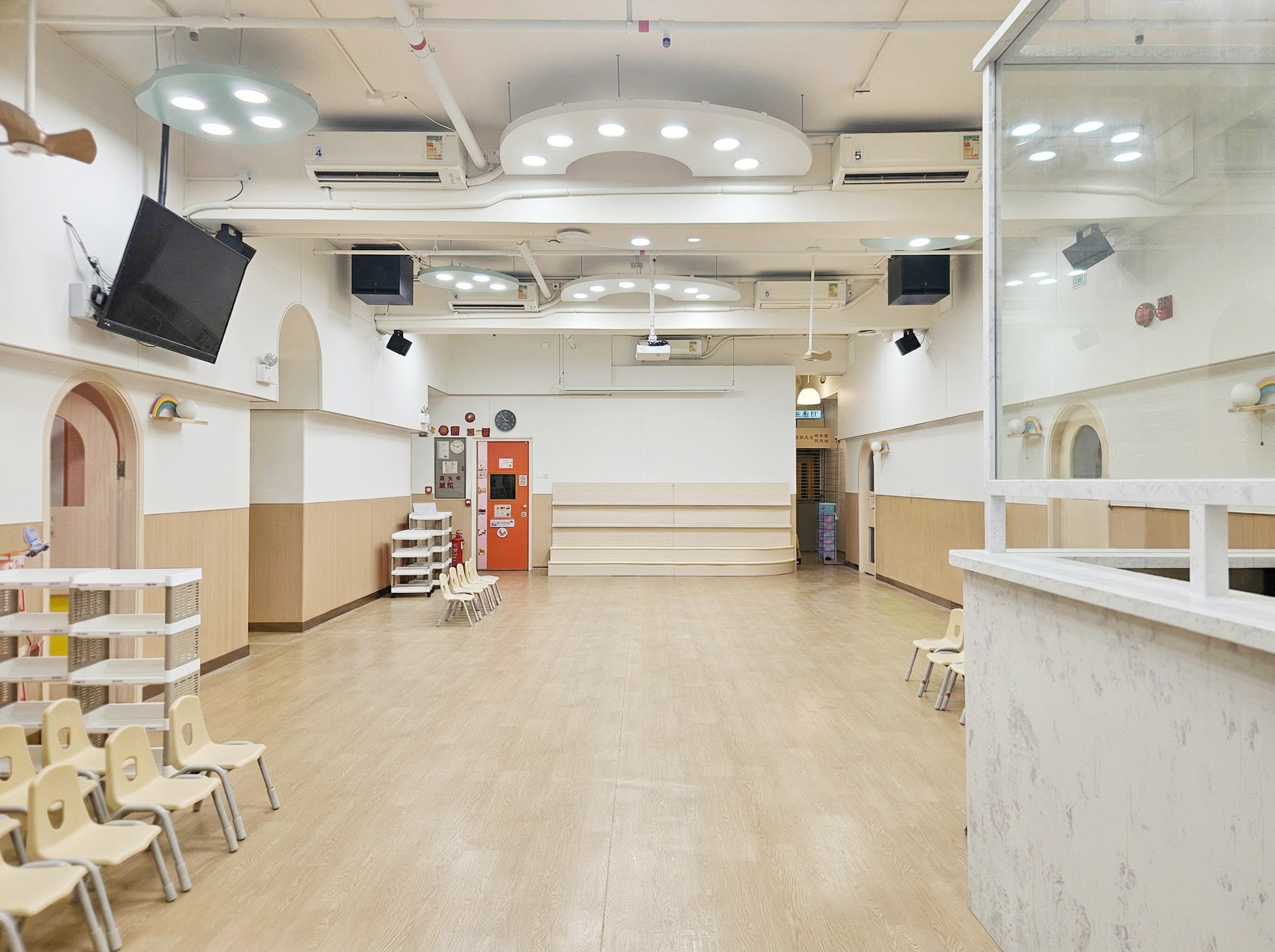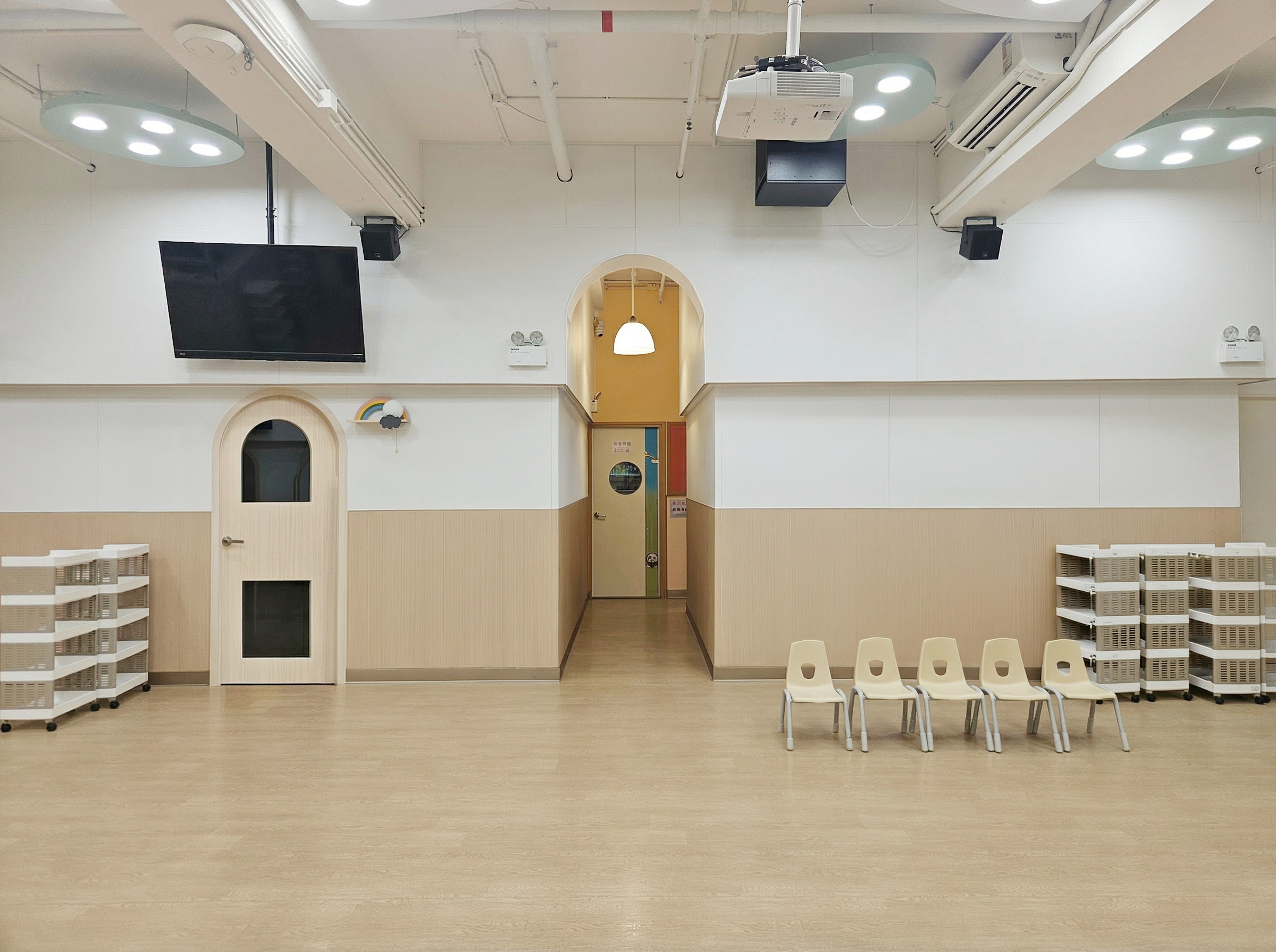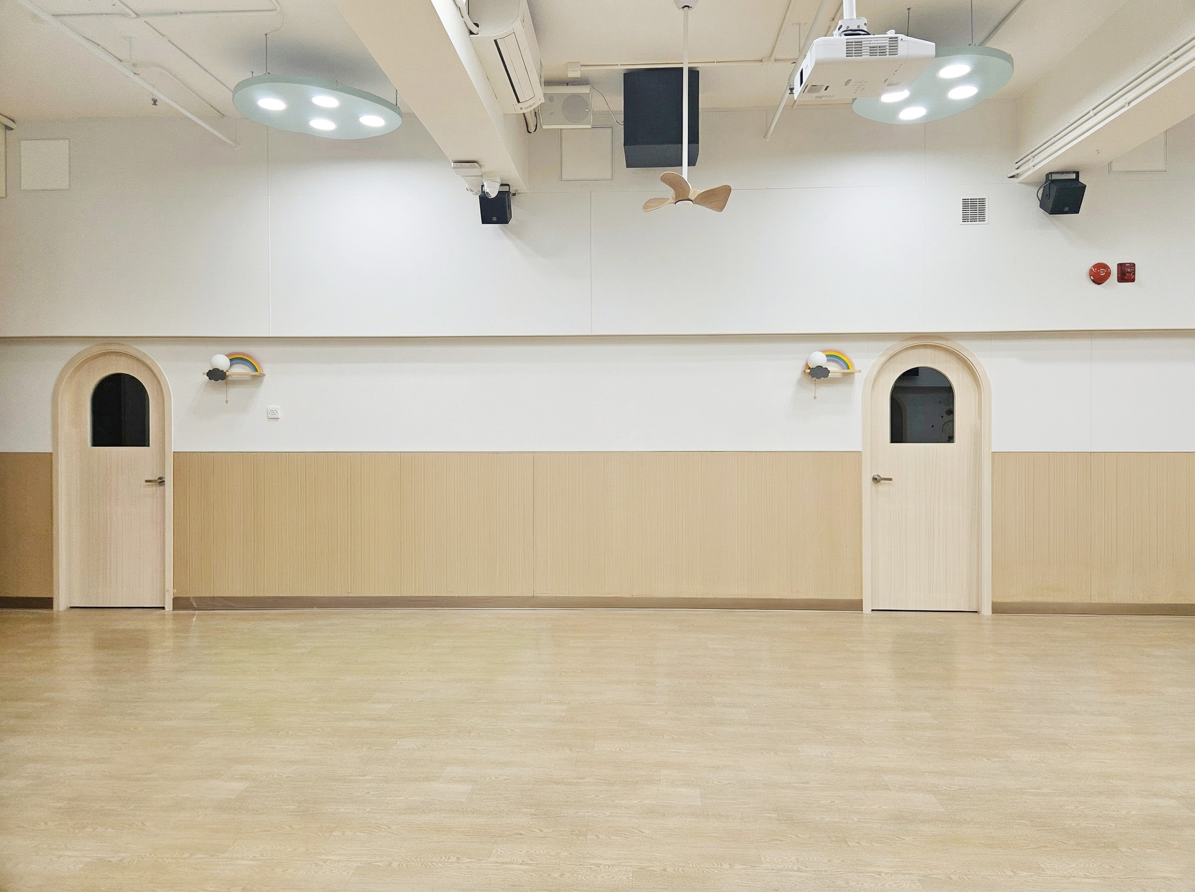 全校以淺木色與白色為主調,搭配竹纖維板作為牆身圍板,既環保又完全符合香港幼稚園的消防及安全標準。圓形、拱形、半圓等柔和造型隨處可見,不僅有效避免尖角風險,更象徵完整與團結。特別訂製的天花設有機圓型白色鋁質元素,搭配 TIFFANY BLUE 吊燈作為點綴,既活潑明亮又柔和不刺眼。再輔以市面上易購的薄筒燈,營造出層次豐富的照明效果——自然大窗採光、櫃底間接背光、軌道燈與吊燈,全數採用暖白光,完美保護幼兒視力。這套統一的設計語言,讓整體呈現出「一個大家庭」的溫馨整體感。