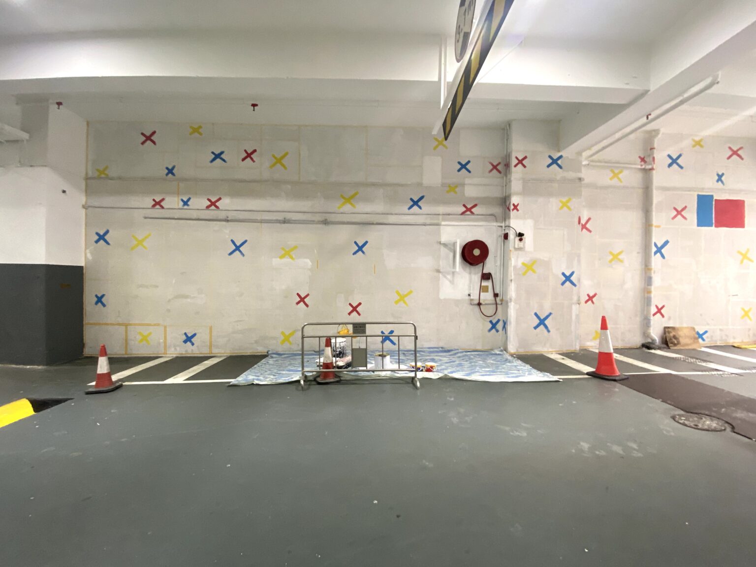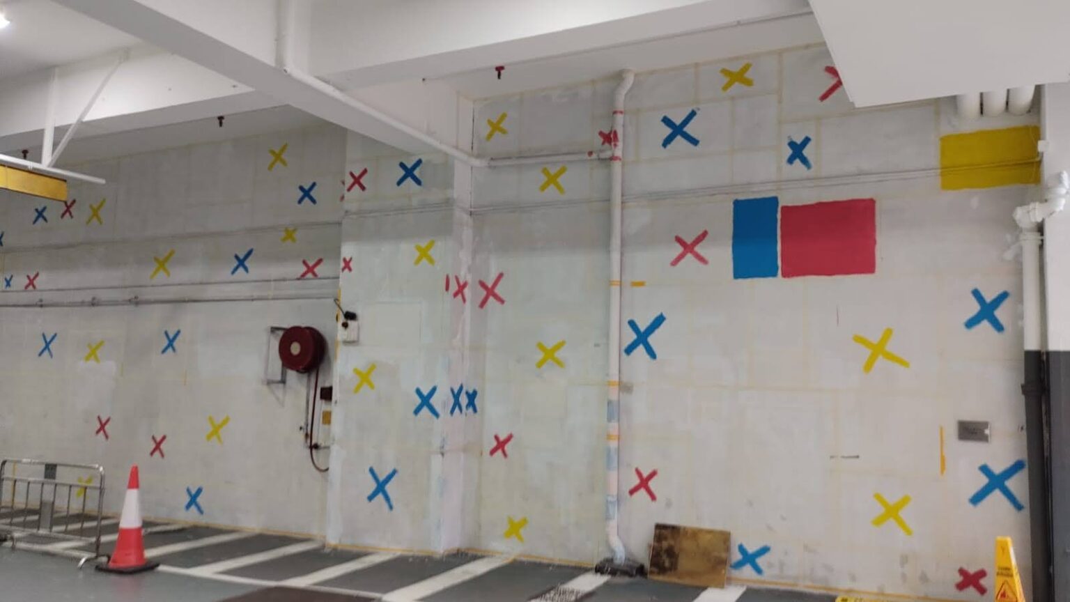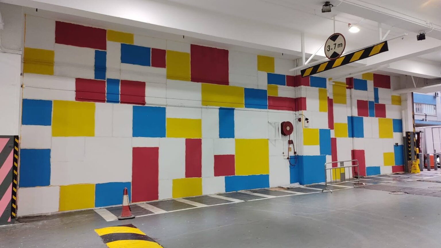 環境提升:原本冷冰冰的混凝土空間,透過Mondrian風格的色彩與幾何圖案,變得溫暖而有趣,提升使用者的空間體驗。