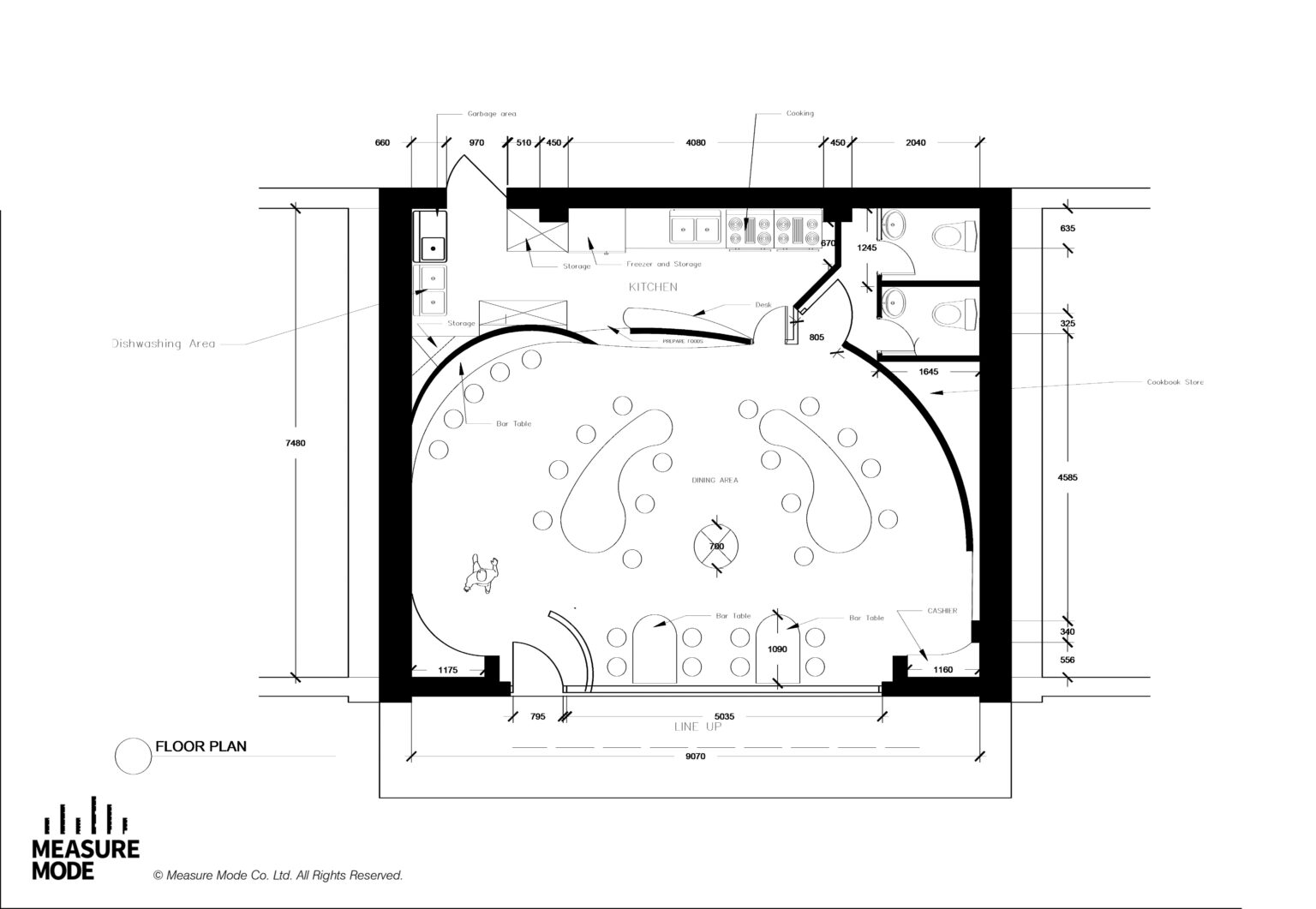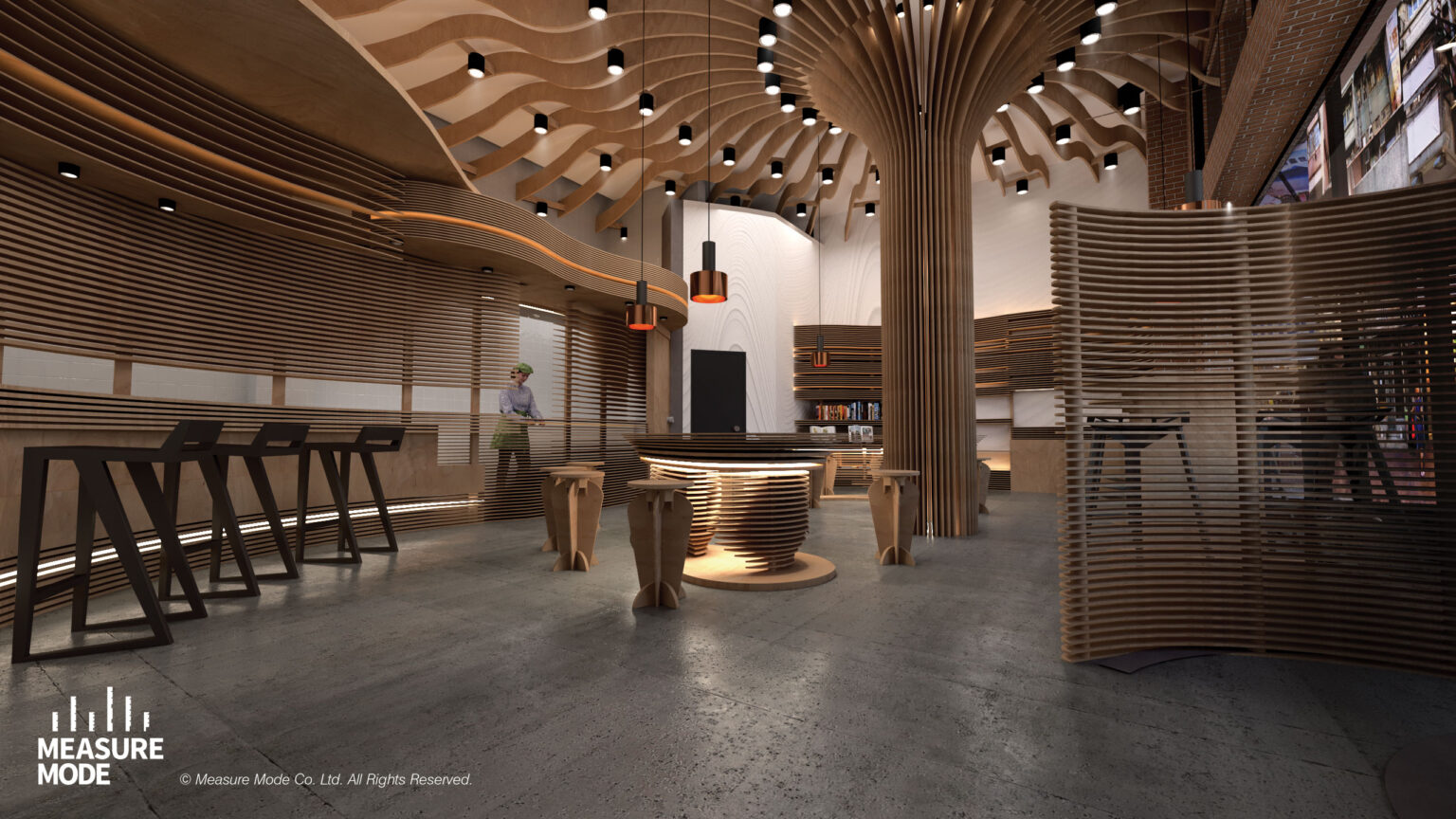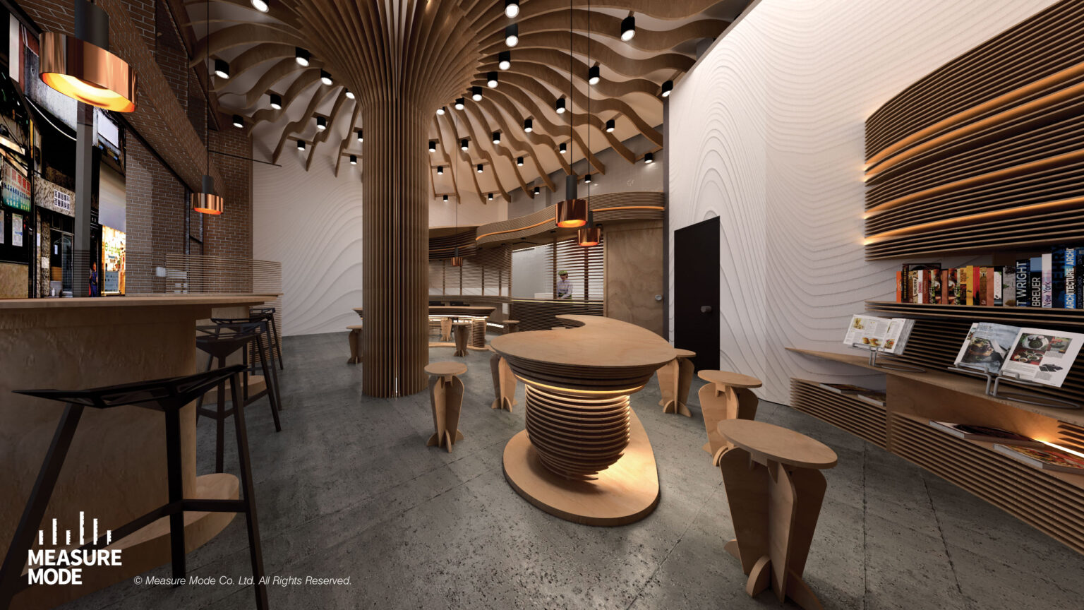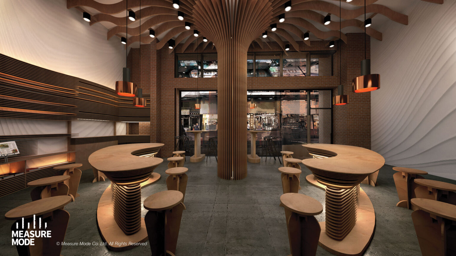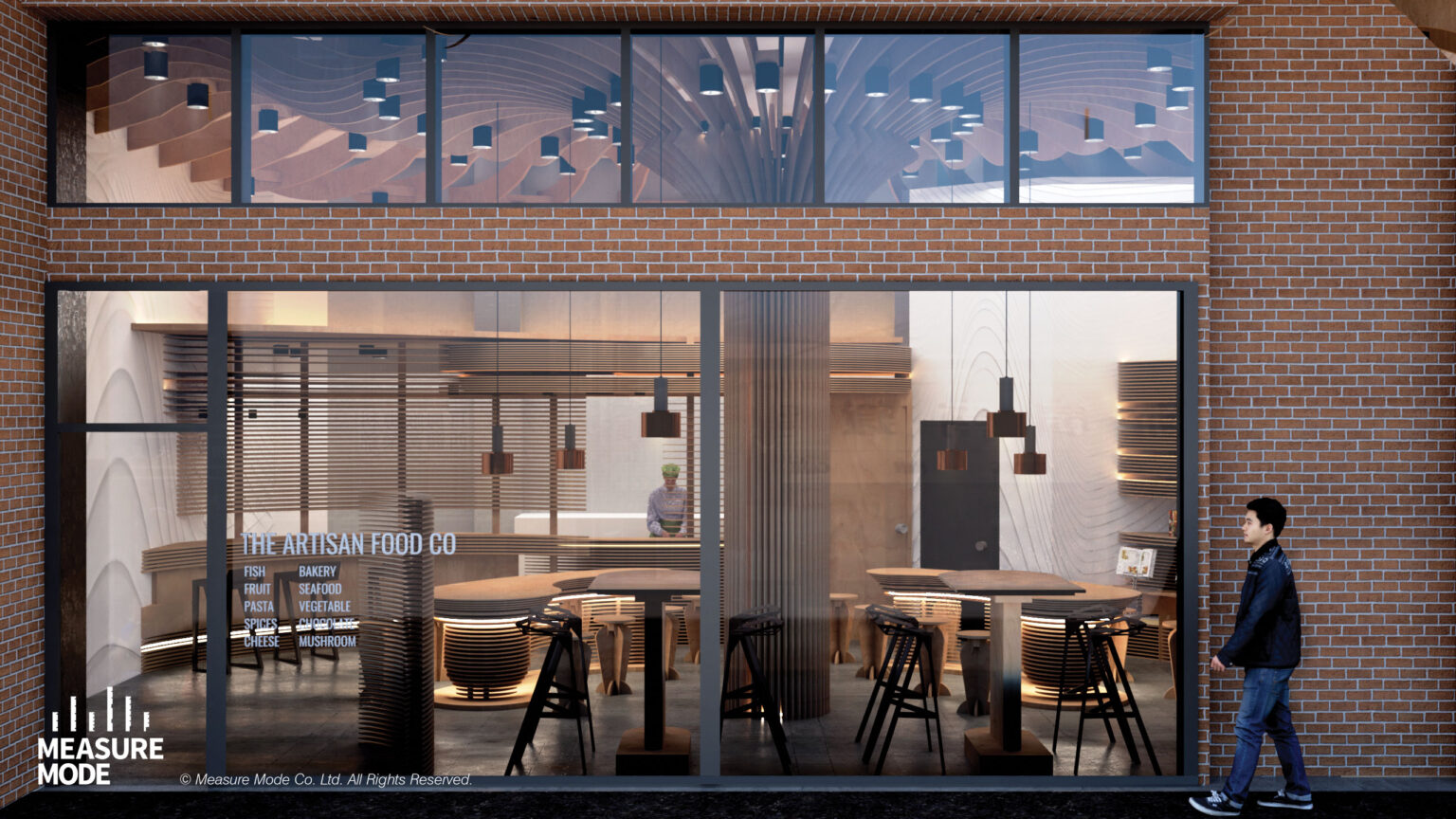 以蘑菇的形態與解構為靈感,設計反映自然與食物之間的緊密關係,呼應餐廳高品質快餐與健康食品的定位: