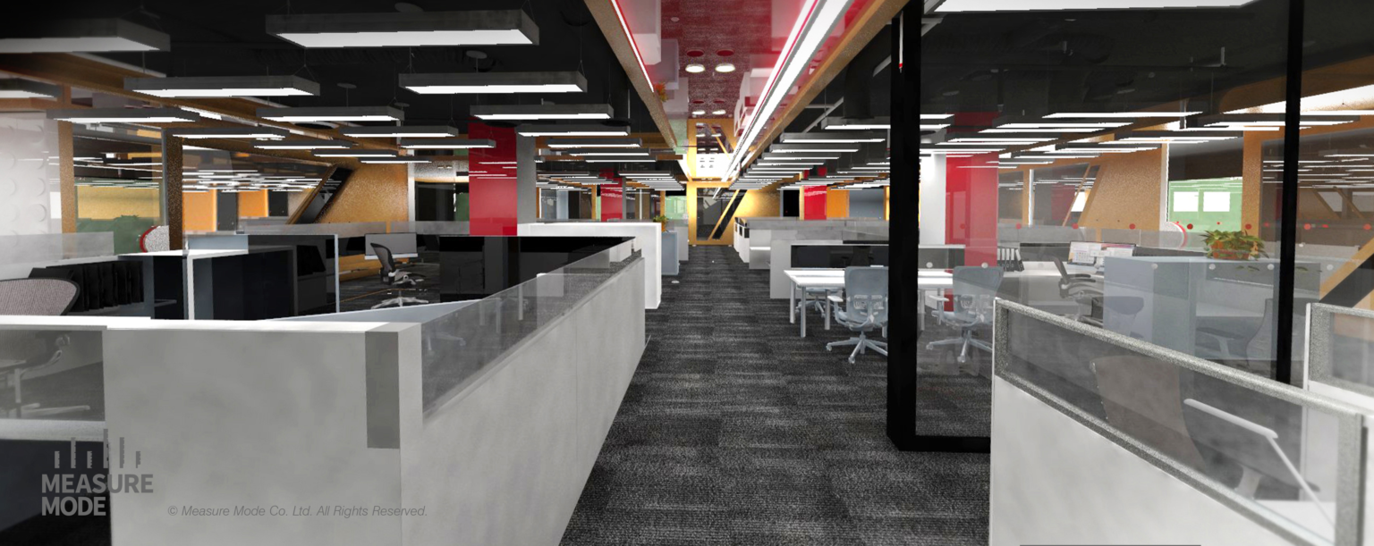 - 傢俱:斜腳辦公桌、紅黑會議系統、斜線紋理地毯。