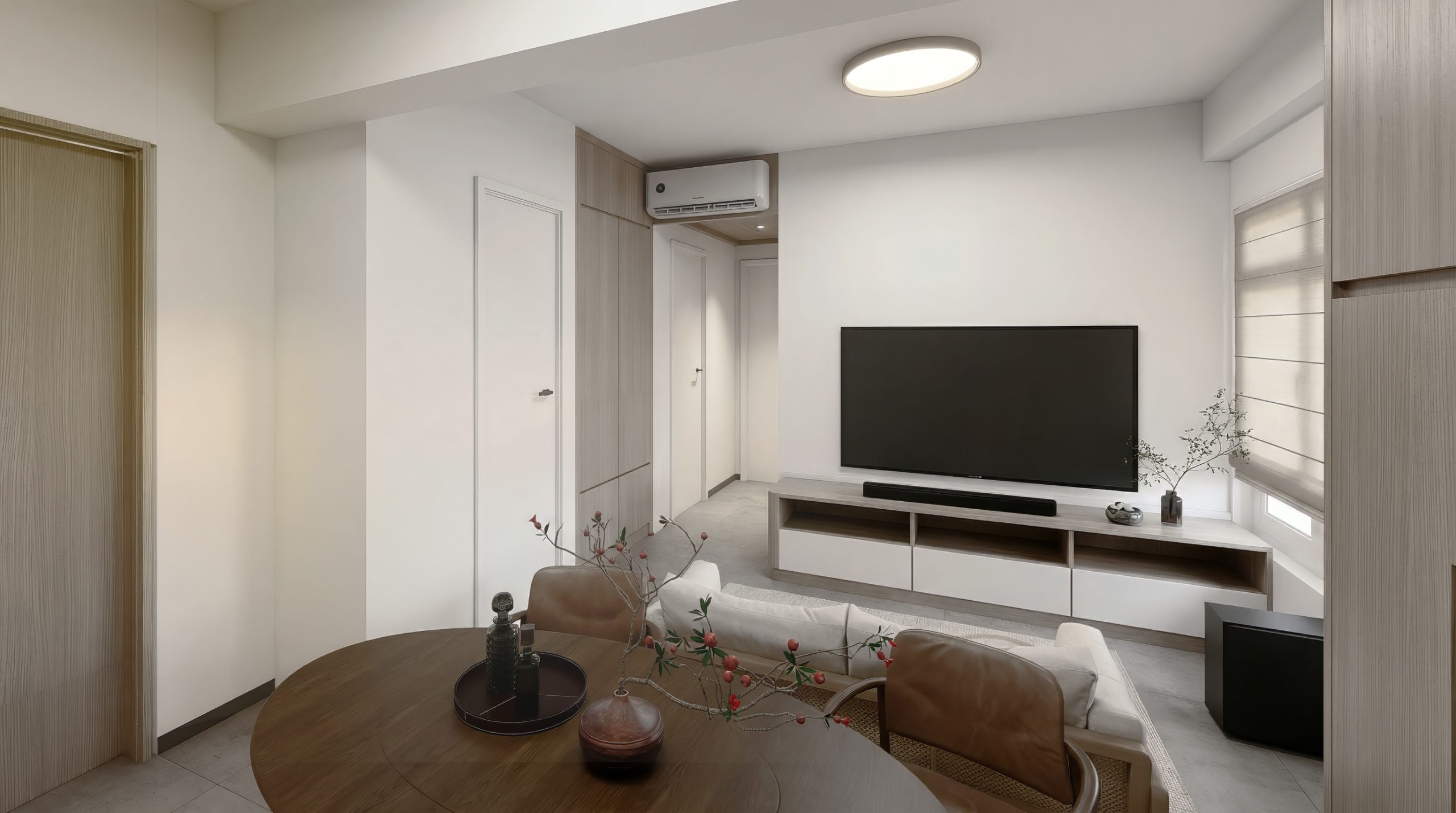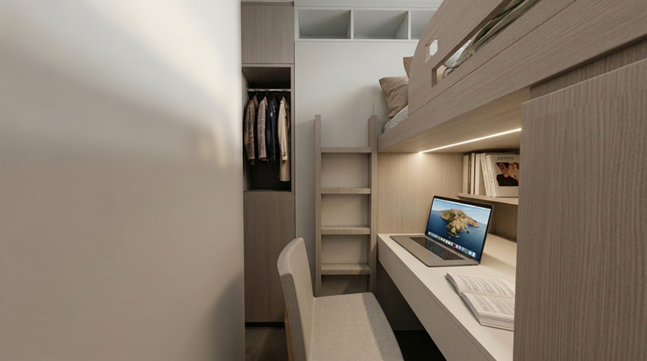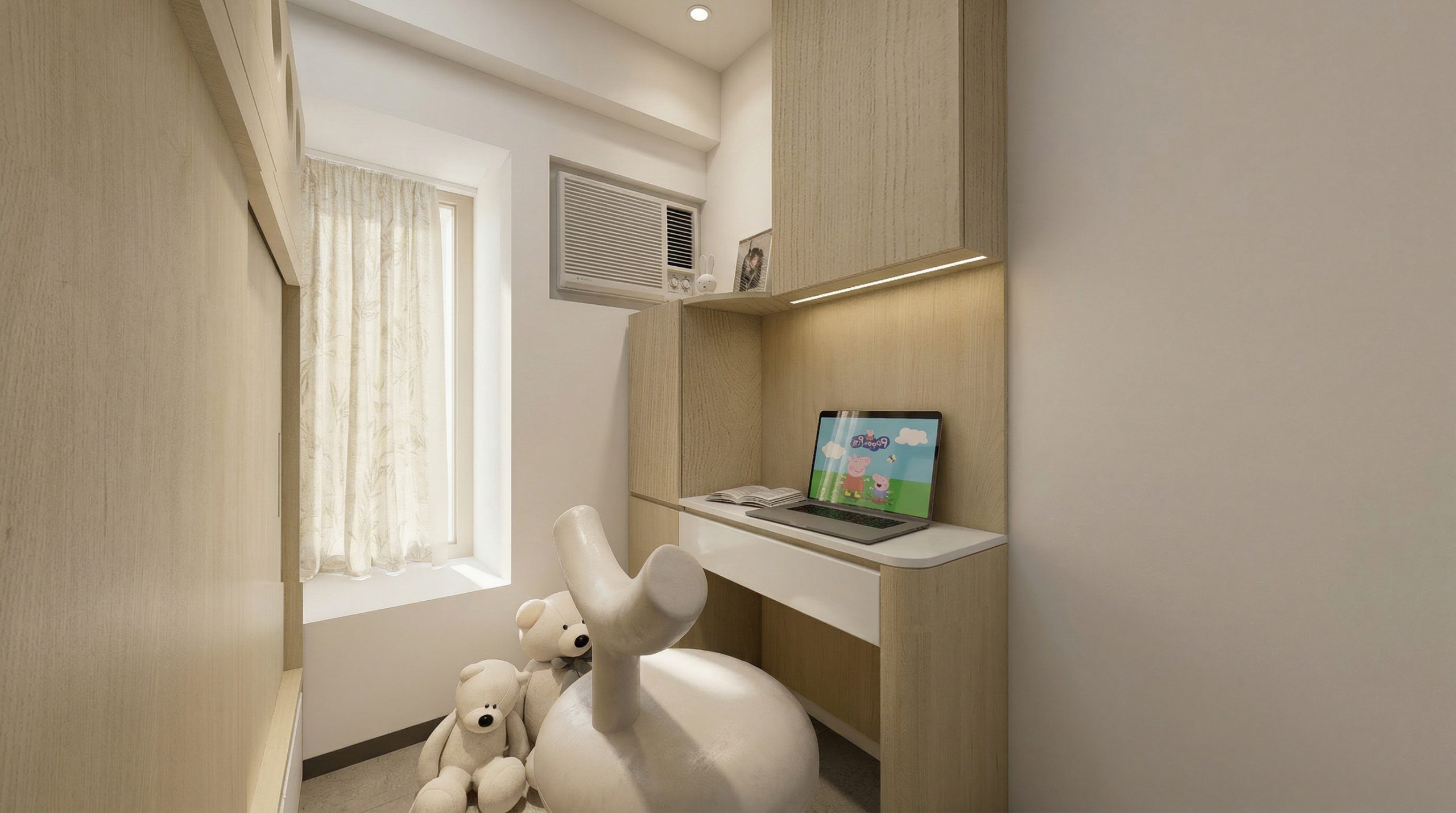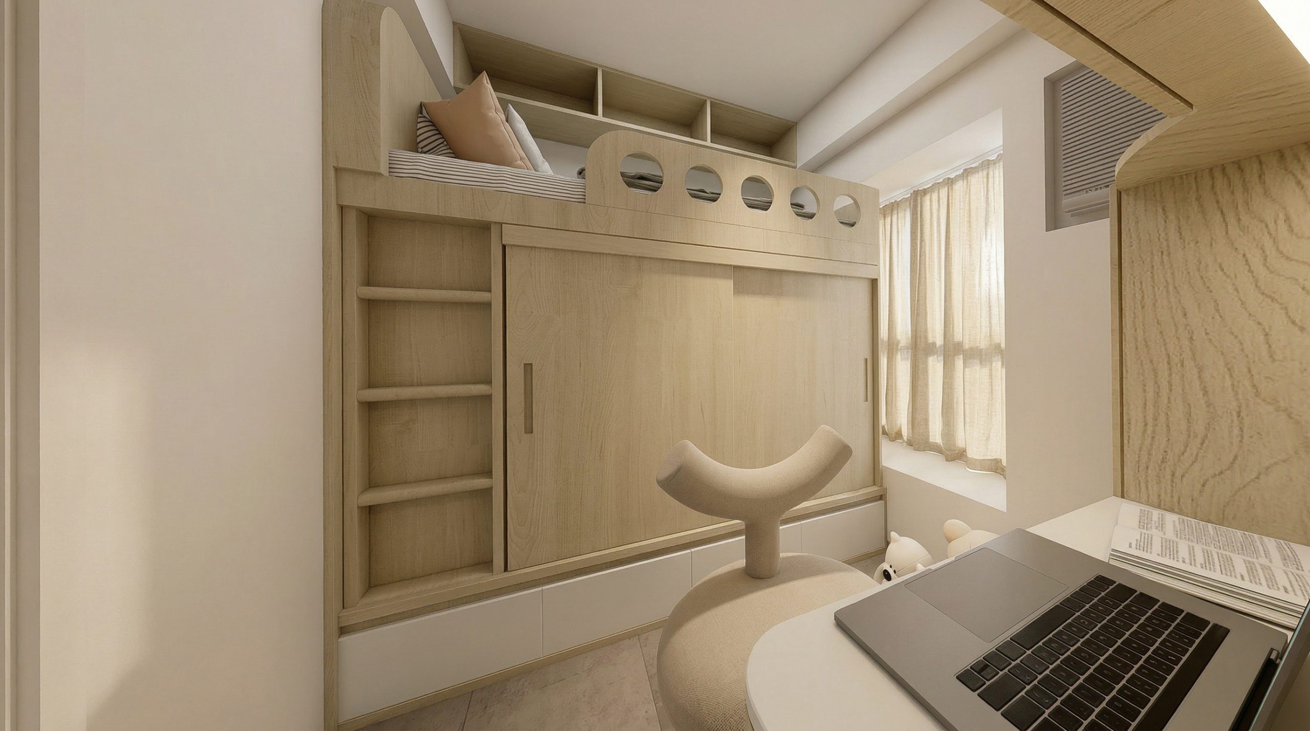設計最能體現「機能美學」。上下舖床體一體成型,床底與床頭均設大量抽屜與櫃體;書桌區配可調LED燈帶、開放格櫃與舒適座椅,學習區、睡眠區、儲物區三合一。窗邊空調與窗簾設計保留採光整體細節注入童趣與學習,卻不破壞整體淺木調性。