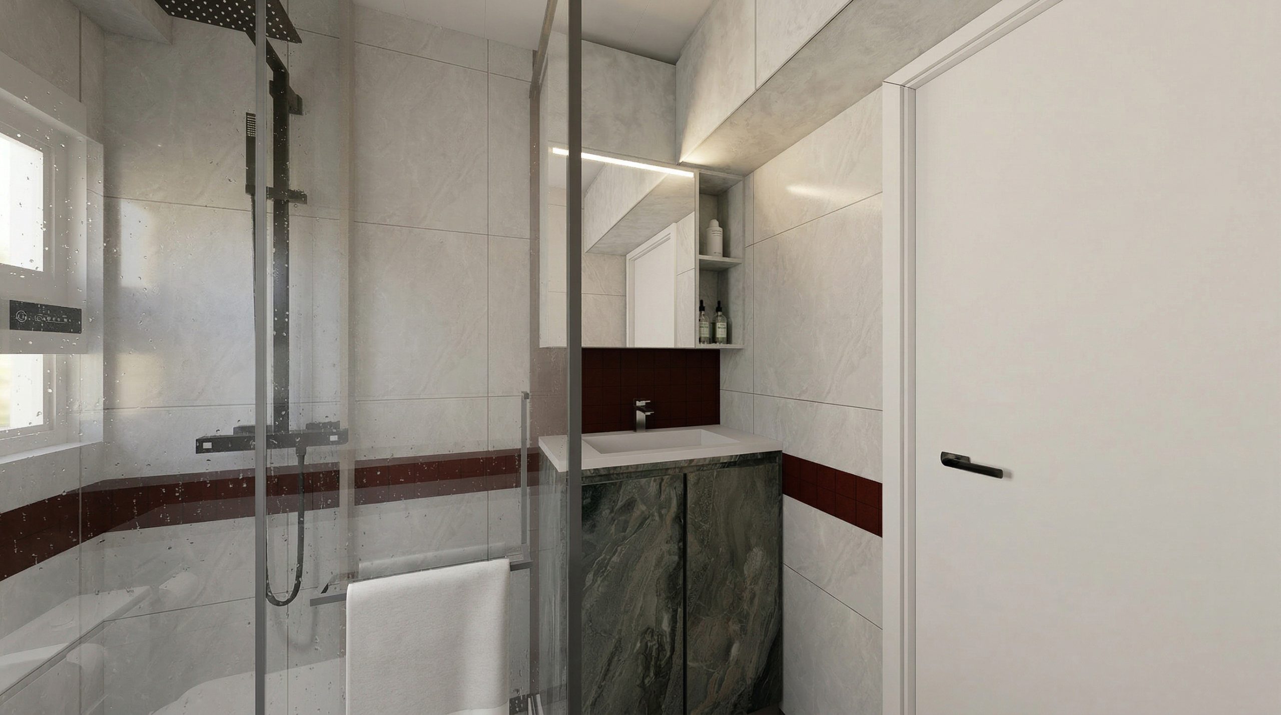 乾濕分離設計採用灰白大理石紋瓷磚,紅色腰線成為視覺焦點。玻璃淋浴間配黑金屬花灑,懸浮式大理石紋洗手盆櫃結合鏡櫃LED燈帶,收納與照明一次到位。