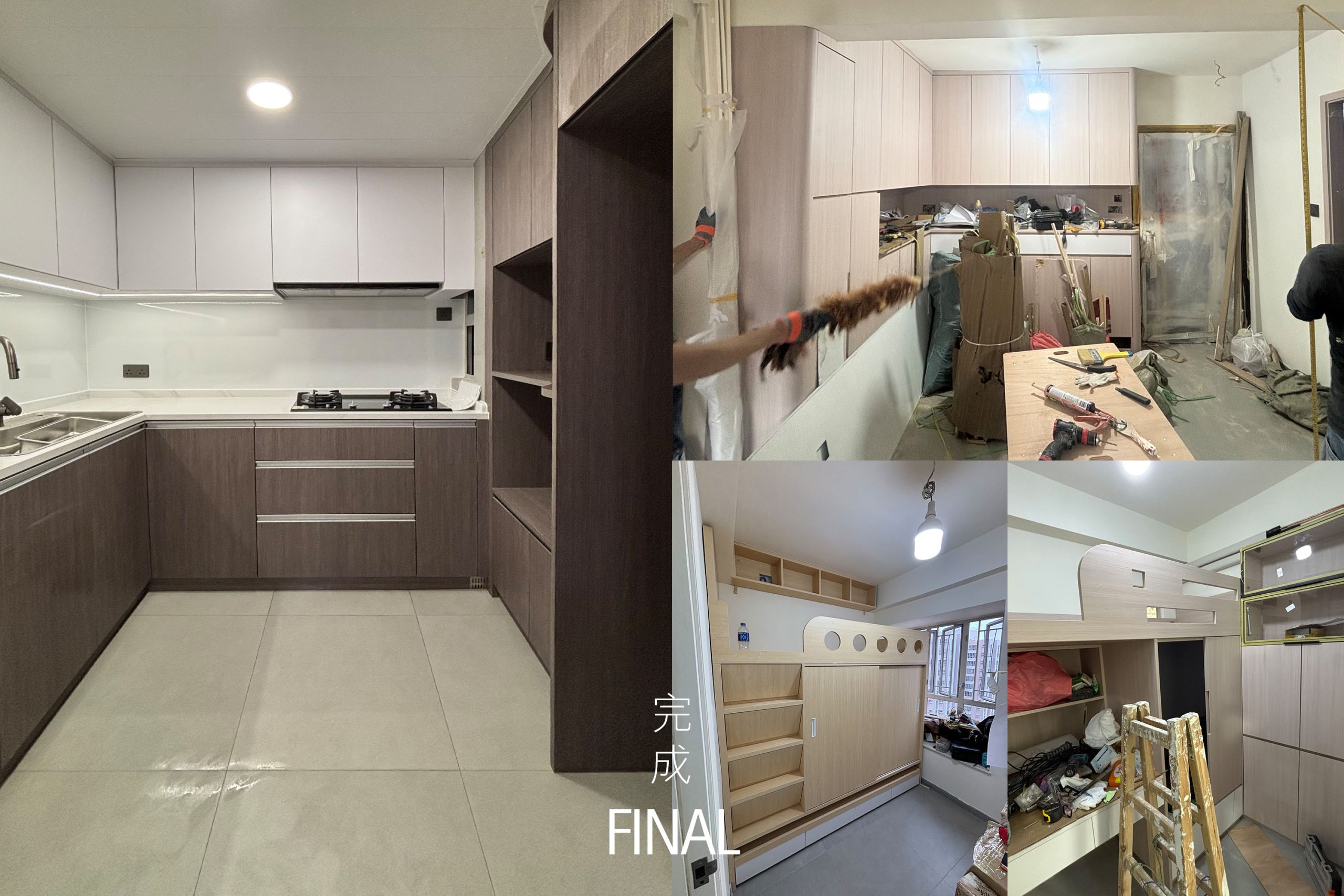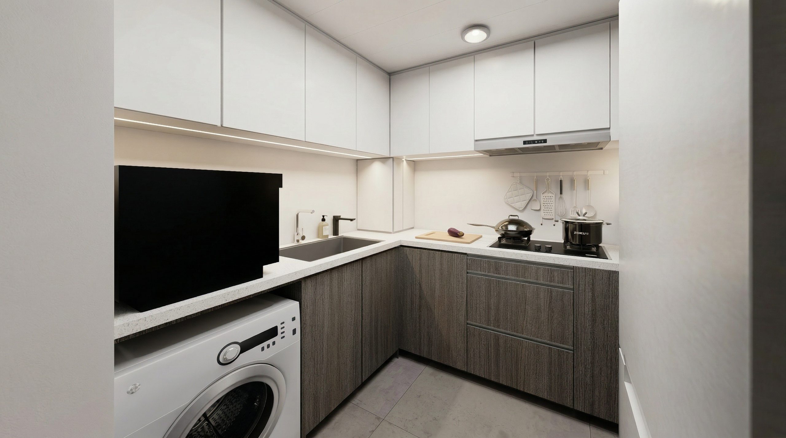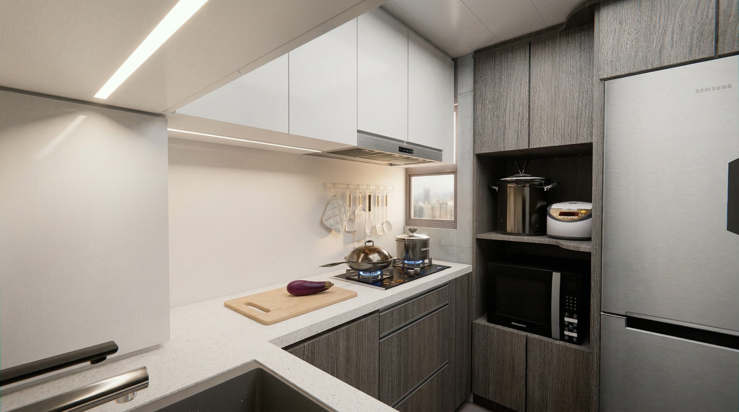 L型布局是亮點:上櫃純白高光、下櫃深木紋形成視覺對比,既明亮又耐看。石英石檯面一體成型,嵌入式洗衣機、燃氣爐、抽油煙機與雪櫃完美整合。LED燈帶沿天花與櫥下延伸,烹飪時光影柔和;窗邊小窗引入自然光,徹底解決香港廚房常見的壓迫感。