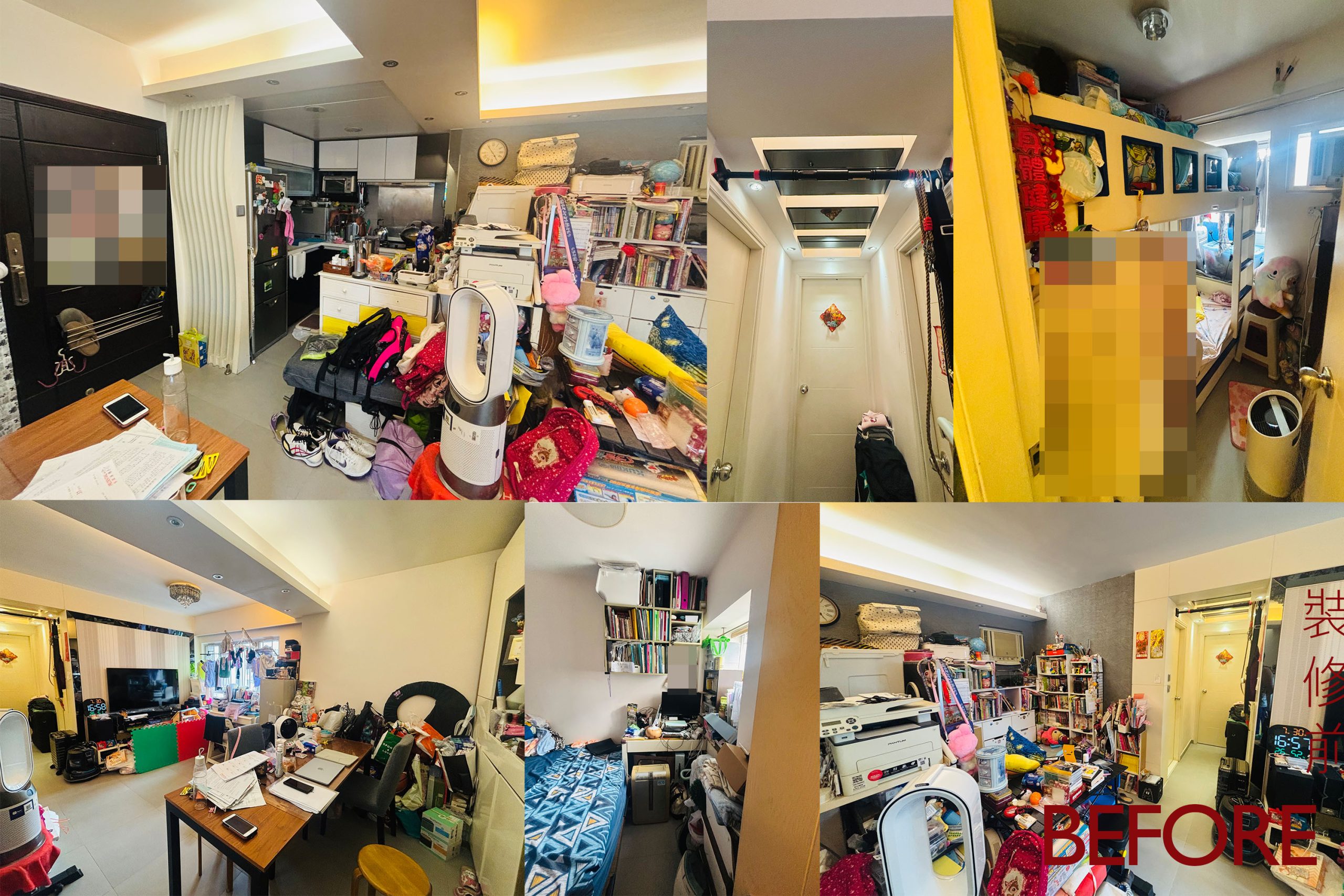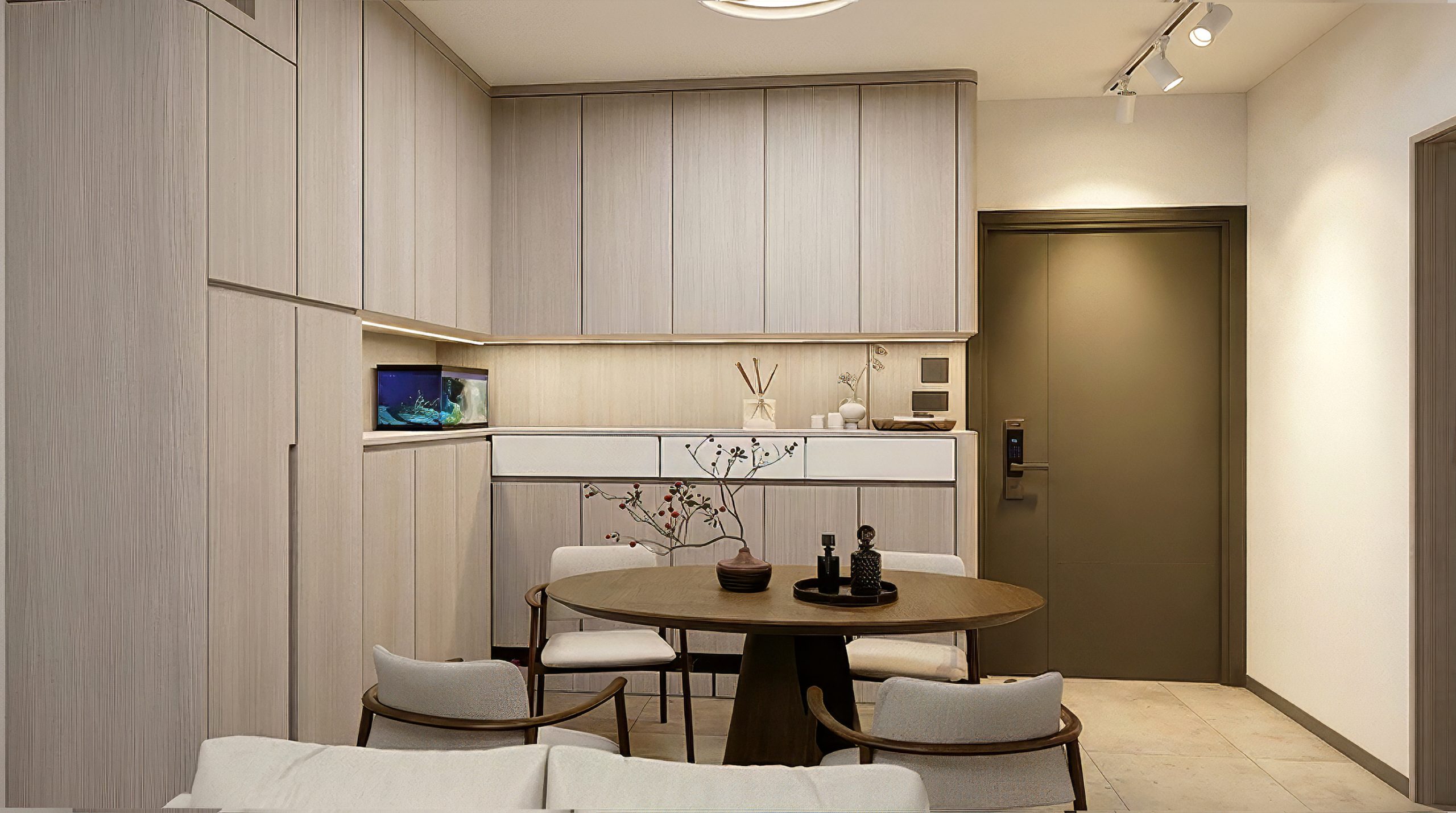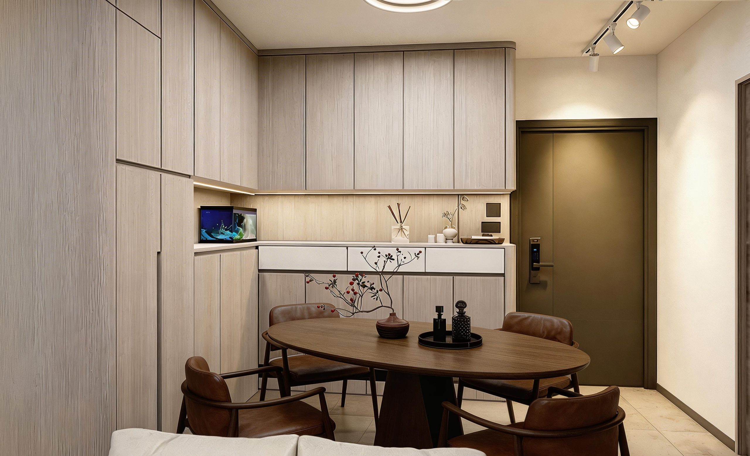 L型布局是亮點:上櫃純白高光、下櫃深木紋形成視覺對比,既明亮又耐看。石英石檯面一體成型,嵌入式洗衣機、燃氣爐、抽油煙機與雪櫃完美整合。LED燈帶沿天花與櫥下延伸,烹飪時光影柔和;窗邊小窗引入自然光,徹底解決香港廚房常見的壓迫感。