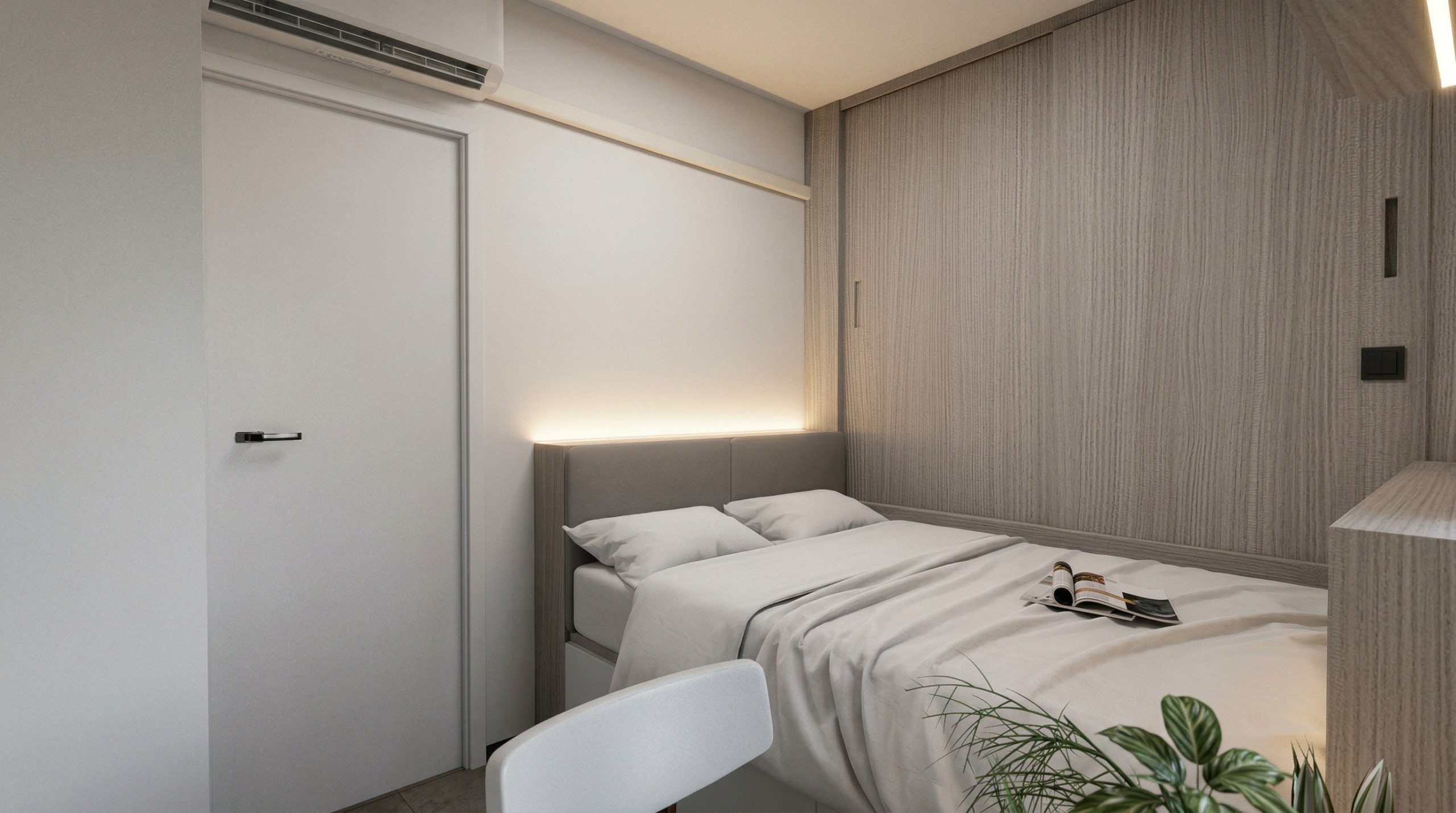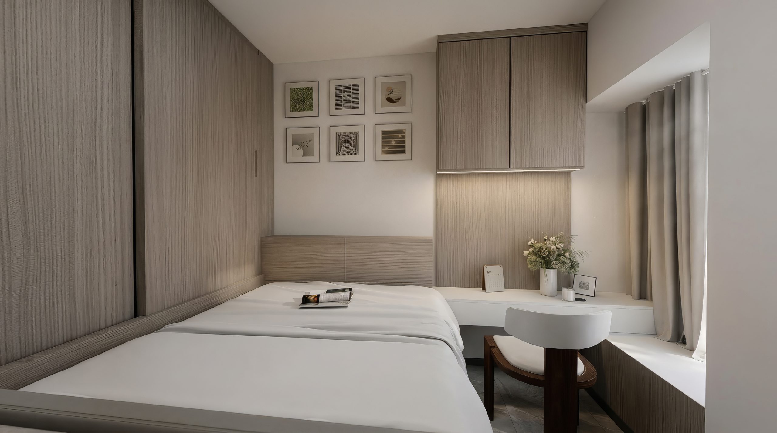淺木紋一體式衣櫃與床頭板無縫連接,白色床品乾淨俐落。窗邊書桌與飄窗位結合,窗簾與間接燈帶營造放鬆氛圍;牆面六幅小畫形成視覺焦點,展現「少即是多」的極簡美學。